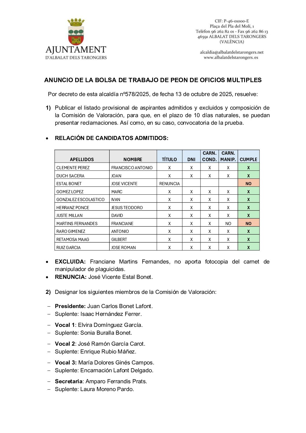 3. ANUNCI DE LA BORSA D’OCUPACIÓ DE PEÓ D’OFICIS MÚLTIPLES. LLISTAT PROVISIONAL D’ADMESOS I ESCLOSOS. COMPOSICIÓ DE LA COMISSIÓ DE VALORACIÓ.